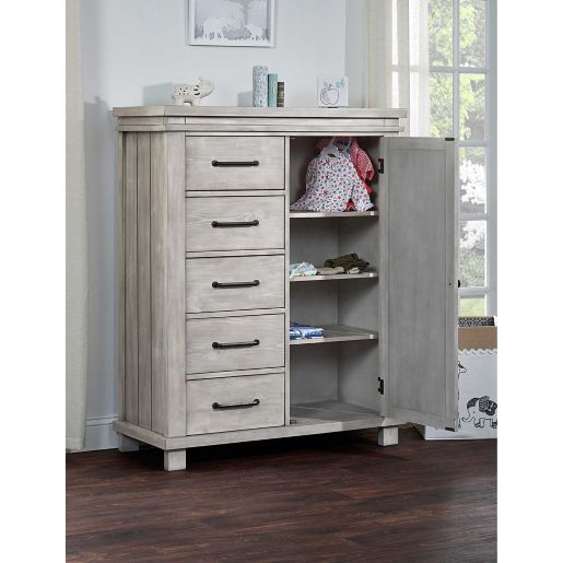 Classic clean lines 5 drawers and a door with adjustable shelving sit atop sturdy square feet making this stylish storage piece deliver years of usage. Behind the door there is a hanging bar and 3.